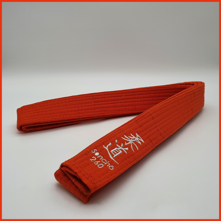 Der Orangegurt für alle Träger des 5. KYU ist mit den japanischen Kanji „Judo“, unserem Logo sowie der Gürtellänge bestickt, wodurch ihm ein besonders edles Aussehen verliehen wird.